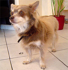 Schüchterner “Gismo” (Chihuahua-Spitz-Mix) vorher... ...nachher, Unterwolle entfernt und beigeschnitten